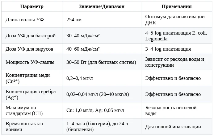 Для Legionella полная инактивация достигается при концентрациях меди 0,2–0,4 мг/л и серебра 0,02–0,04 мг/л за 2–24 часа.
