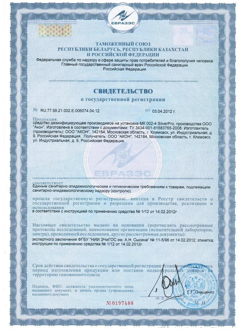 В результате успешно проведённых исследований компания АКОН получила право на официальное применение системы обеззараживания воды методом ионизации медью и серебром SilverPro в плавательных бассейнах, с получением Свидетельства о государственной регистрации и внесением в официальный реестр дезинфицирующих средств.