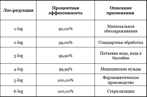 Глубина обеззараживания — это количественная мера эффективности процесса, показывающая, какая доля (или сколько порядков) микроорганизмов была инактивирована. Выражается в логарифмических единицах (lg).