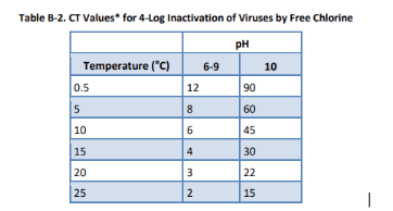 Пример: таблица СТ-фактора инактивации вирусов хлором при глубине обеззараживания(эффективности) 99,99%, при температуре 25град и интервале рН 6-9 СТ=2