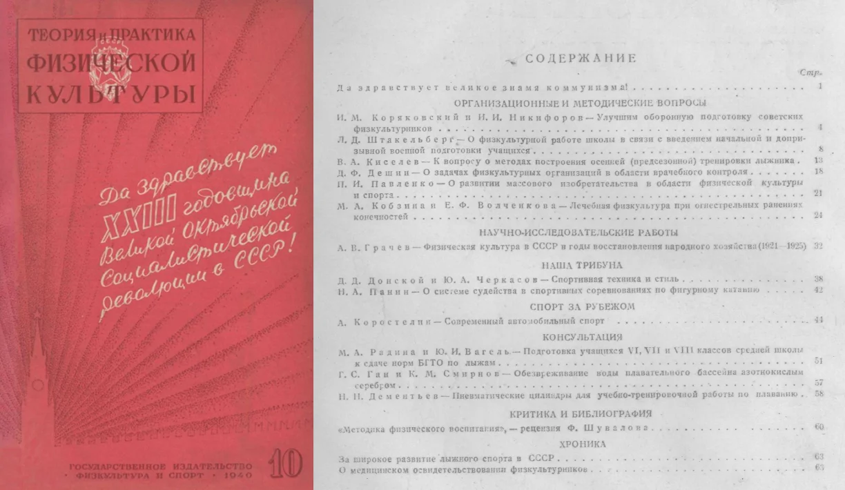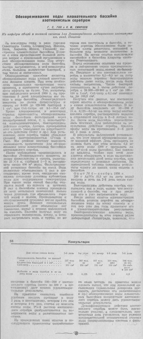 Статья «Обезвреживание воды плавательного бассейна азотнокислым серебром» в журнале «Теория и практика физической культуры» №10, октябрь 1940 г.